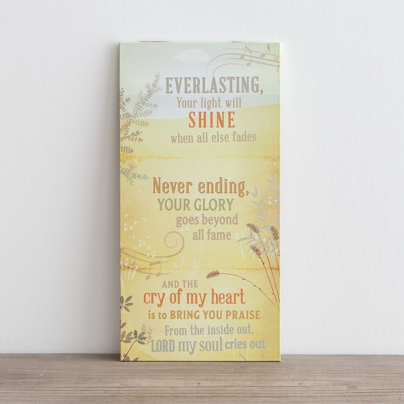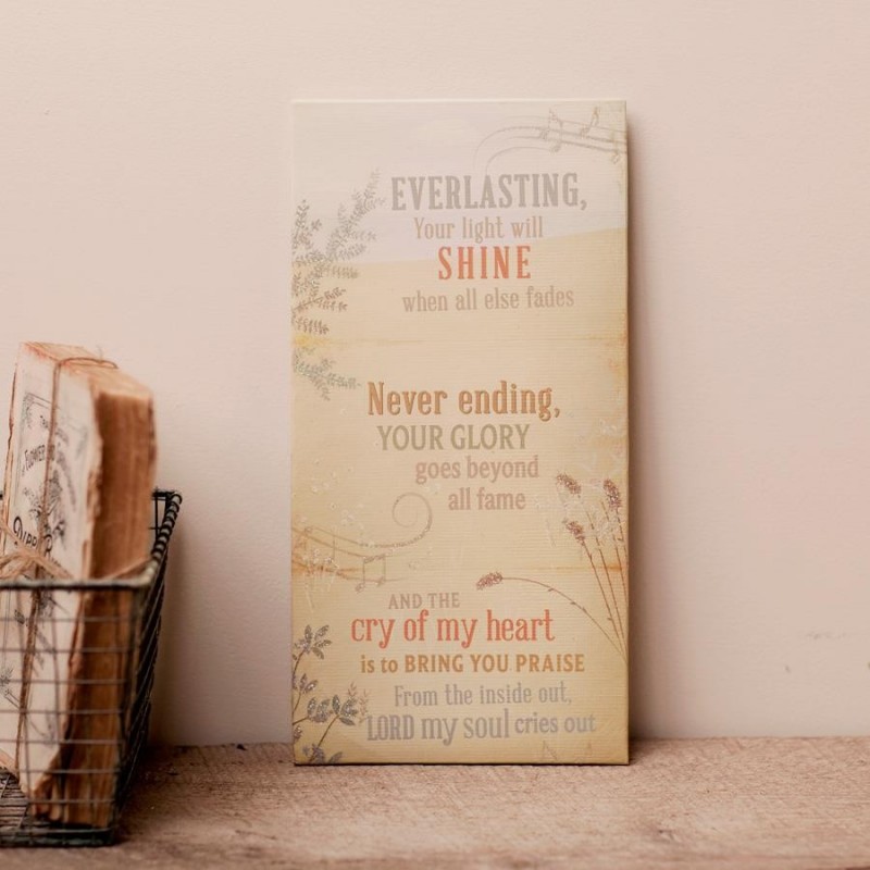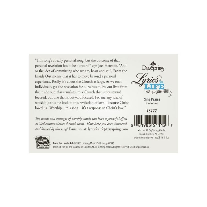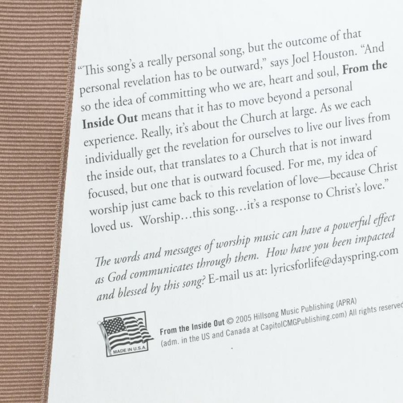 "As we each individually get the revelation for ourselves to live our lives from the inside out, that translates to a Church that is not inward focused, but one that is outward focused. Worship...this song...it's a response to Christ's love," says songwriter, Joe Houston. Imprinted with lyrics from the powerful worship song, From the Inside Out, this inspiring wall plaque brings heartfelt inspiration into your home and/or office, with a sweet touch of whimsy. A great gift for any occasion!